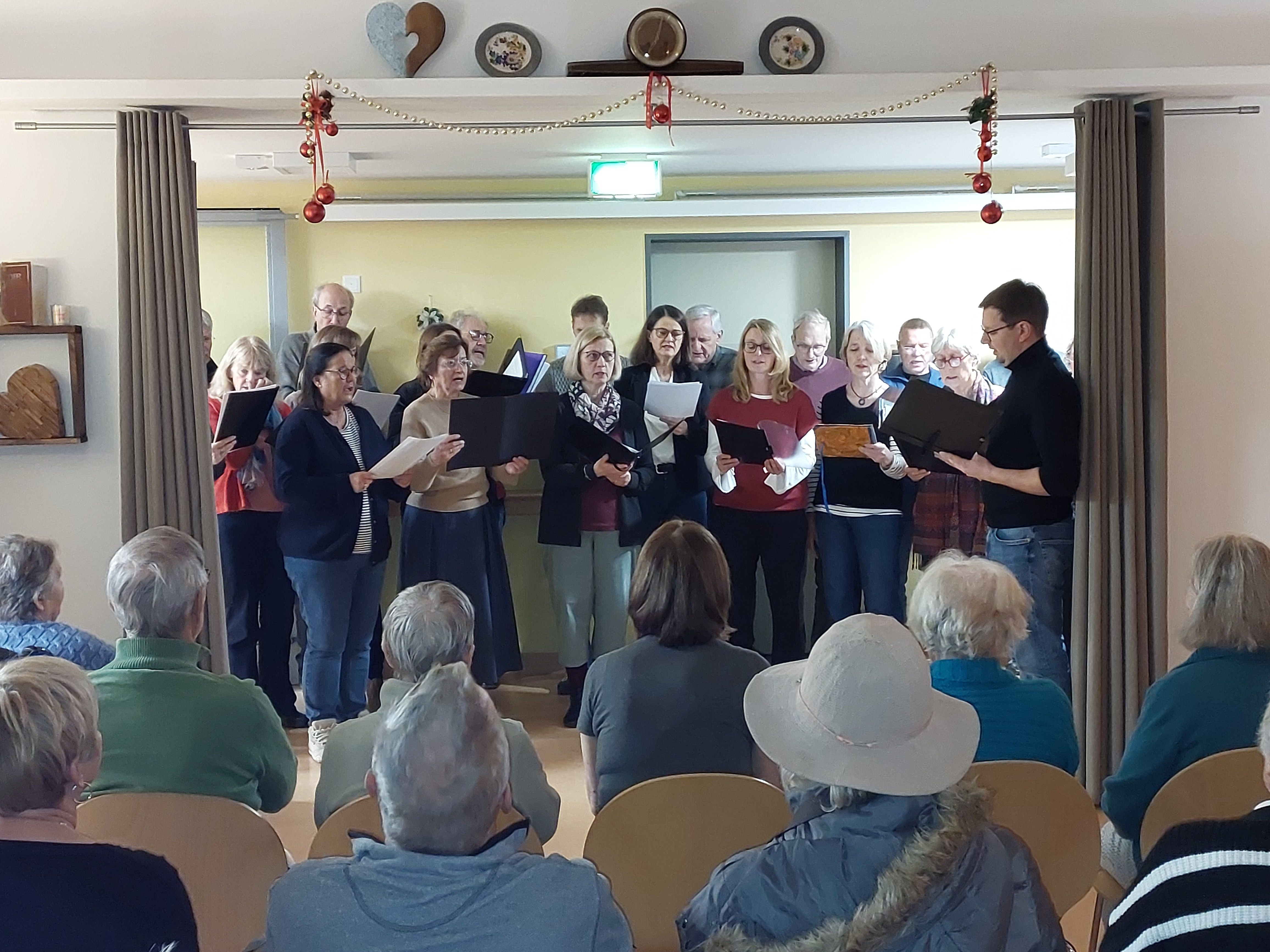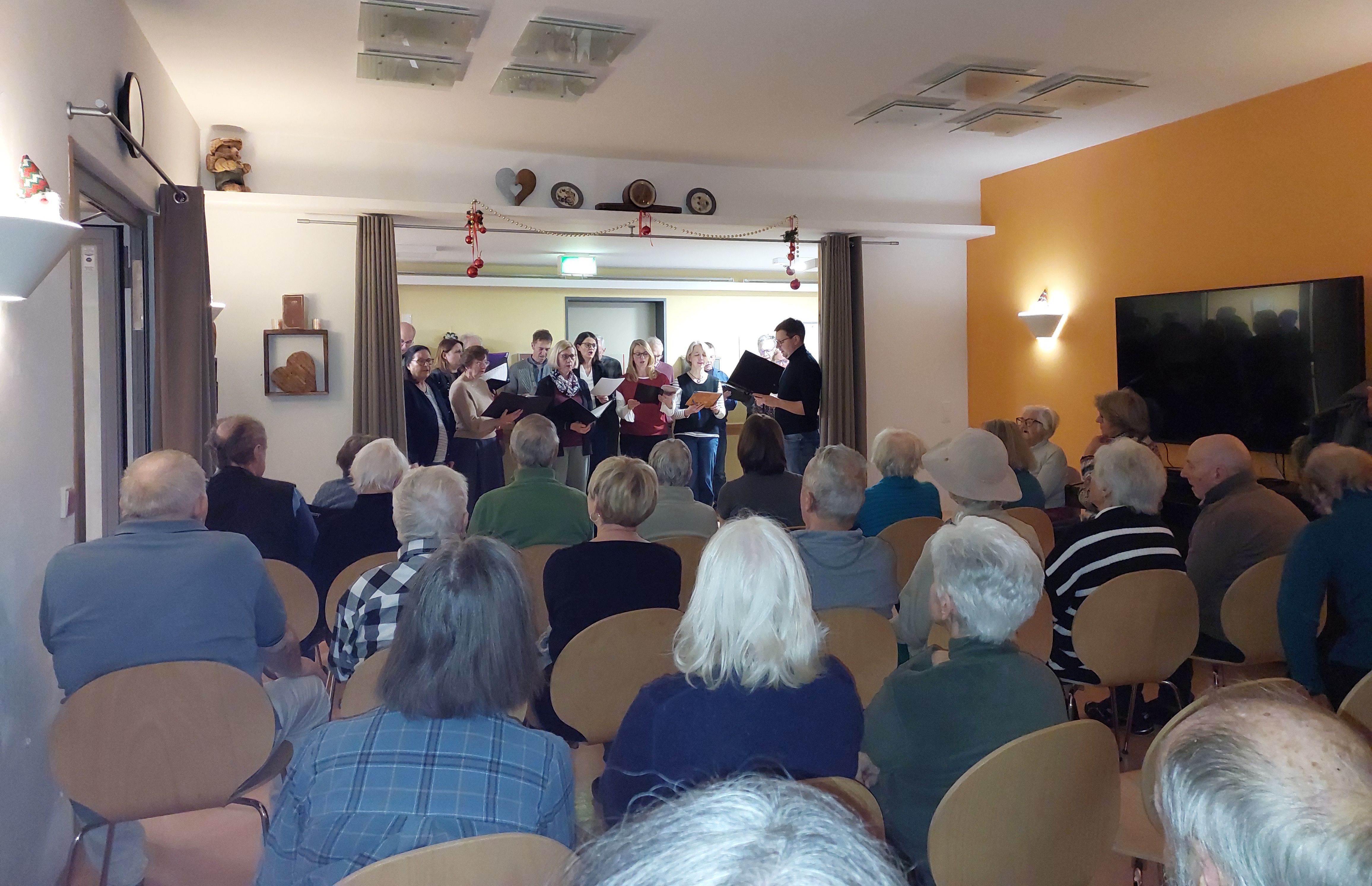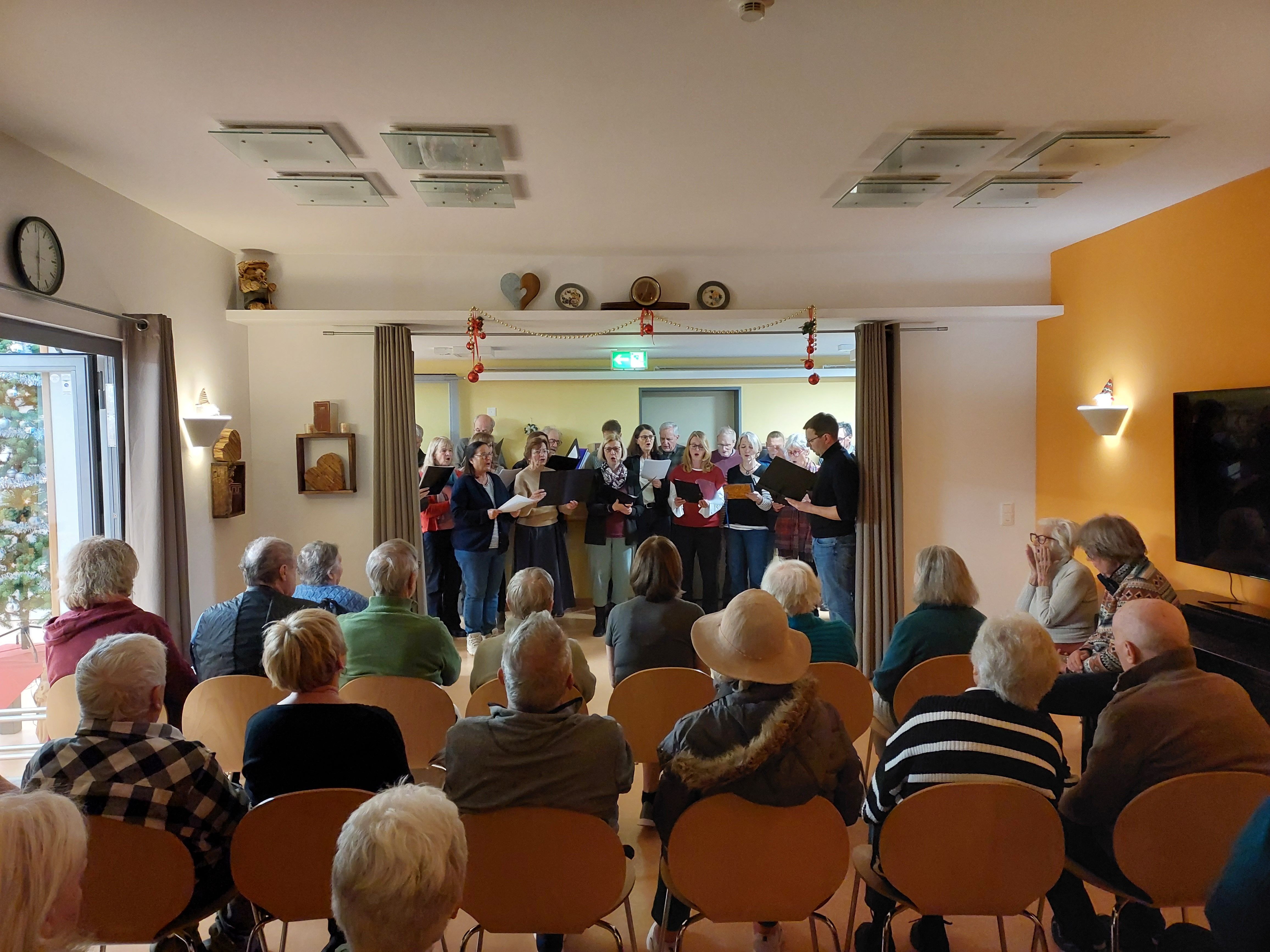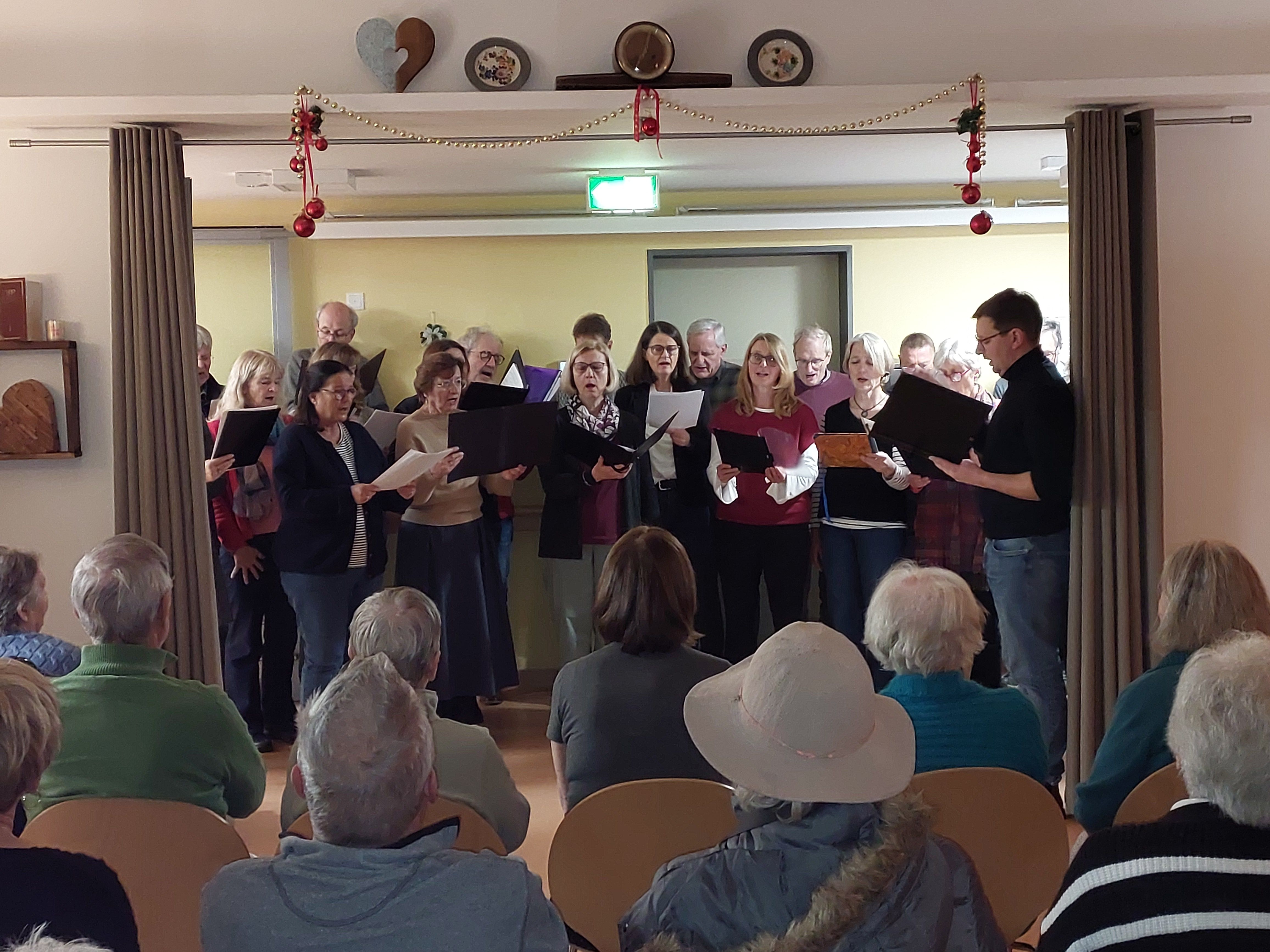 Ungefähr 20 Sängerinnen und Sänger erfreuen uns mit klassischen Weihnachtsliedern, von “ Fröhliche Weihnacht überall”, über " Es ist ein Ros entsprungen" bis hin zu “ Stille Nacht, heilige Nacht".